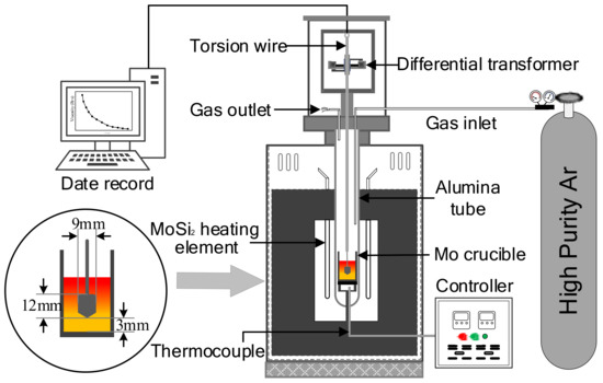 The viscosity measurements were conducted with the rotating spindle method. The experimental apparatus used to measure the viscosity of slags was shown in Figure 2. Using seven MoSi2 heat elements to heat the furnace, a Pt–6%Rh and Pt–30%Rh thermocouple was used to monitor and control the furnace temperature (error ± 2 K). Then, the computer calculated and recorded the viscosity values when the spindle was rotating.