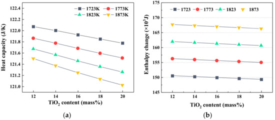 The heat capacity and enthalpy change of slag with varying TiO2 contents are shown in Figure 4. It could be observed from Figure 4a that the heat capacity of slag presented a linear decreasing trend as the TiO2 content increased at the target temperature, and it also decreased as the temperature increased at a constant TiO2 content. Meanwhile, when the temperature rose from 1723 K to 1873 K, the decrease rate of heat capacity augmented with increase in TiO2 content. Figure 4b shows the enthalpy change of slag as a function of TiO2 content at different temperatures. It could be seen that the enthalpy change decreased slightly with the increase in TiO2 content and increased dramatically with increasing temperature. The heat capacity and enthalpy change of slag are the important physicochemical properties of slag. The higher the heat capacity, the more heat energy slag needs to absorb when its temperature rises by one degree Celsius, which means that the temperature of slag with a larger heat capacity is difficult to change as the heat quantity supply varies. Therefore, the low TiO2 content in slag is beneficial to keep the temperature of slag constant. As mentioned earlier, the heat absorbed by the slag is approximately equal to the enthalpy change value of the slag, so the increase in TiO2 content and the decrease in temperature could decrease the heat storage capacity of slag. It was suggested that when the TiO2 content increased in the range of 12 to 20 mass%, the heat supply of the BF should maintain stability due to the large fluctuation of slag temperature.