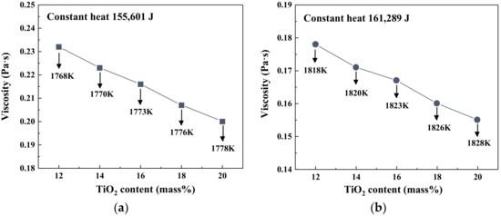 The viscosity of slag with varying TiO2 content under constant heat quantity: (a) 155,601 J; (b) 161,289 J.