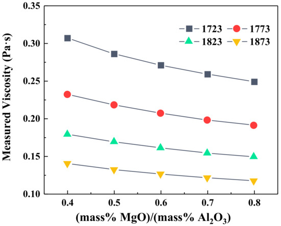Figure 6 shows the effect of MgO/Al2O3 ratios on the viscosity of slag at different temperatures. The increase in MgO/Al2O3 ratios lowered the viscosity of slag at the experimental temperature, and the decrement in viscosity at high temperatures was not obvious. This is consistent with the previous studies [10,18,19,20], where MgO is classified as a basic oxide similar to CaO in the silicate melts, and it acts as a network modifier. Furthermore, MgO could provide free oxygen ions to cut down the Si–O bonds in the network structure, resulting in the decrease in the DOP of the slag structure, expressed as Equations (10) and (11) [4,21]. These transition processes could improve the fluidity of molten slag.