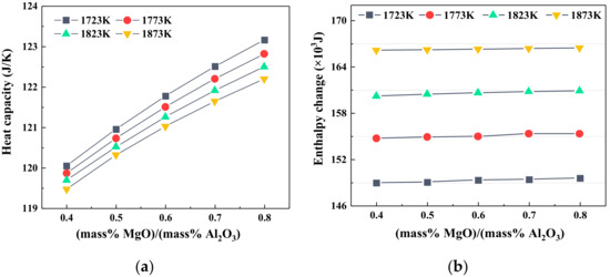 The heat capacity and enthalpy change of slag with different MgO/Al2O3 ratios; (a) heat capacity; (b) enthalpy change.