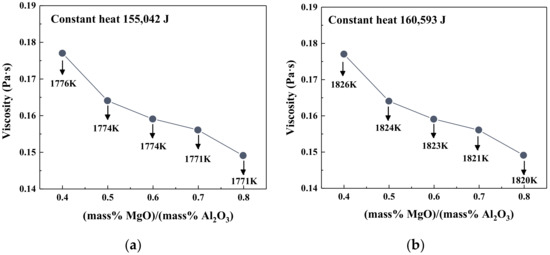 The viscosity of slag with different MgO/Al2O3 ratios under constant heat quantity: (a) 155,042 J; (b) 160,593 J.