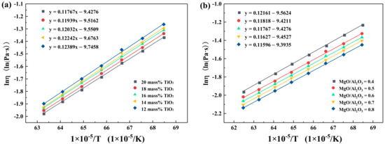 From Equation (4), ln( ) has a linear relationship with , which is shown in Figure 9. The slope of the fitting line (R2 > 0.95) is the apparent activation energy Ea. The calculated results of apparent activation energy are listed in Table 2. As expected, the apparent activation energy decreased from 123.89 kJ/mol to 117.67 kJ/mol with the TiO2 content from 12 to 20 mass%, and it also decreased from 121.61 kJ/mol to 115.96 kJ/mol with the increment of the MgO/Al2O3 ratio from 0.4 to 0.8. This indicated that the frictional resistance of melts and the fraction of complex structural units decreased. The results were consistent with the variation of viscosity.