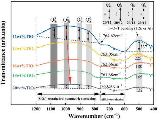 The FTIR spectra of the quenched slag were measured to obtain information about the slag structure. The original FTIR spectra for the amorphous samples with different TiO2 content at fixed basicity of 1.10 are presented in Figure 10. According to the previous studies [24,25,26], the vibration bands of silicate are assigned to the range of 1200 to 400 cm−1. The spectra were divided into three wavenumber bands: 1200–760 cm−1, 760–600 cm−1, and 600–400 cm−1. For [SiO4]-tetrahedral bands, it was divided into four typical silicate structural units Qn (n = 0, 1, 2, 3, which represents the number of bridge oxygen atoms per silicate tetrahedral structure) and represented the DOP of the melted structure. The assignment of each band is shown in Table 3.