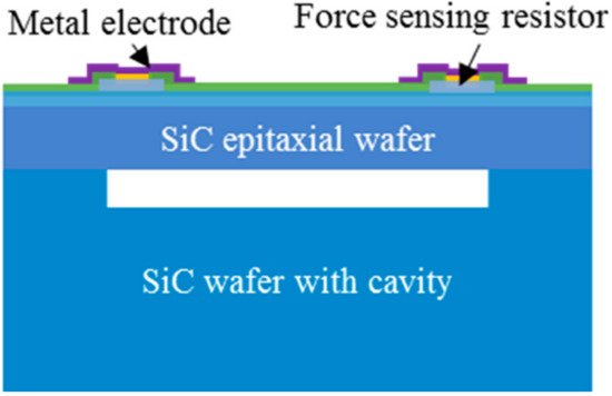According to the above research status, we propose a processing method to achieve the sealing cavity structure for an all-SiC piezoresistive pressure sensor. The schematic diagram of the device is shown in Figure 1. In brief, a SiC diaphragm would be bonded onto a SiC wafer with shallow grooves using room temperature bonding technology (~23 °C), followed by force-sensing resistors and metal electrode fabrication. The force sensing resistors are located on the pressure diaphragm for sensing external test pressure and obtained by the plasma-etching process, and the electrode structure of the device is prepared through a metallization process. The structure is used for connecting the force sensing resistors with external test circuit. The SiC diaphragm is made by mechanical thinning and polishing the side of the nonepitaxial layer of the SiC epitaxial wafer. The SiC wafer with shallow grooves is obtained by inductively coupled plasma (ICP) shallow etching process (~20 μm). Notably, the shallow etching process of SiC can help avoid the time-consuming and laborious deep etching process and can obtain a cavity structure with a flat bottom surface. Moreover, the etch depth can be shallower, thus enabling the shallow grooves to function as overload protection during operation. The SiC thinning and polishing process is compatible with the existing semiconductor process, which is beneficial to improving wafer processing efficiency. In recent years, there has been much research and many breakthroughs on the SiC thinning and polishing process [20,21,22,23]. By optimizing the SiC thinning and polishing process, the whole wafer can achieve higher flatness and film thickness uniformity, so as to achieve the overall uniformity and consistency of hundreds of small diaphragms. For the method of SiC bonding, Yushin et al. have realized direct SiC bonding by loading pressure of 20 MPa in a vacuum environment of 800–1100 °C for 15 h [24] This method has the problem of high energy consumption. In addition, SiC bonding can use intermediate layers, such as Ni metal and glass, but the introduction of the medium layer can easily cause the mismatch of thermal expansion coefficients of different materials [25,26,27]. In our method, using a SiC–SiC room temperature bonding technology can help effectively avoid the material property mismatch problem and the energy consumption caused by a high temperature bonding process.