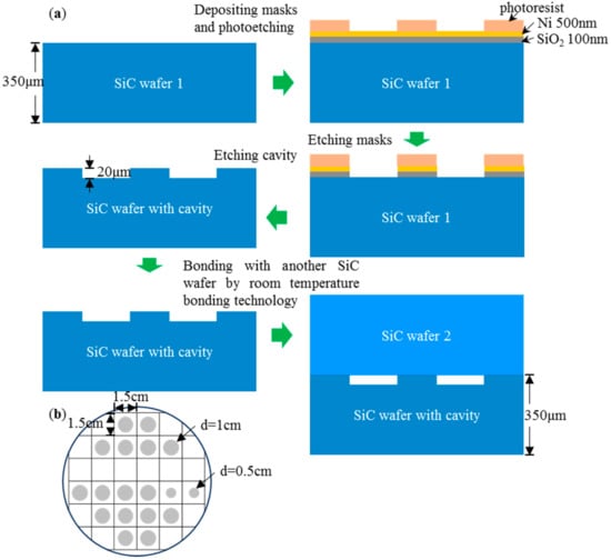 Nowadays, high temperature pressure sensors have attracted extensive attention and research [1,2,3], and are widely used in many industrial and engineering systems, such as turbine engines, oil well exploration, automotive fields [4,5] and measurement of pressure parameters in high temperature reaction vessels. Si (silicon)-based pressure sensors have reached the level of mature production and application; however, Si has limitations at high temperatures [6,7]. Subsequently, silicon on insulator (SOI) substrate significantly improves temperature resistance of the sensor [8,9]. However, SOI is still a Si substrate, and it is difficult to break through the bottleneck of its temperature resistance, which makes people focus on the realization and application of new materials and new technologies. In recent years, SiC has gradually come into people’s field of vision due to its excellent physical and chemical properties as well as high temperature resistance [10,11]. SiC is a very inert material because of its high bonding energy of Si–C bond, which makes it difficult to be oxidized, and it can withstand chemical corrosion and strong radiation damage in the external environment, and these features make SiC capable of excellent application potential in the environment of high temperature and strong corrosion, hence, all-SiC pressure sensors have been demonstrated to work at temperatures higher than 600 °C [12,13,14]. However, due to its high hardness, that is, three times that of Si material, and stable chemical properties, it is extremely difficult to process microelectronics and MEMS (Micro-Electro-Mechanical System) fabrication technology. For example, the preparation of the sealing cavity structure of the pressure sensor has always been a technological challenge for the realization of an all-SiC piezoresistive pressure sensor, as stated earlier, due to the high hardness and stable chemical properties of SiC. Whether by wet etching or dry etching, it is difficult to accomplish the deep etching of SiC (~300 μm) process, because deep etching will severely increase processing time (several hours), or is even impractical to conduct for hundreds of micrometers etching depth, also can cause scratches and poor uniformity of thin film thickness [12,15]. In the wet etching process, there is electrochemical corrosion [16], which is difficult to control with the etching rate and film flatness, and it is easy to cause lateral etching and shape distortion. In this regard, in recent years, many processing methods for SiC pressure sensor cavity structure have emerged, such as mechanical milling, laser scribing, ultrasonic drilling, etc. [17,18,19]. While these methods can improve the processing efficiency of the SiC cavity, it is difficult to ensure the flatness of the cavity surface and the uniformity of the diaphragm, which directly affect the working reliability of the pressure sensor and the overall performance of the device.