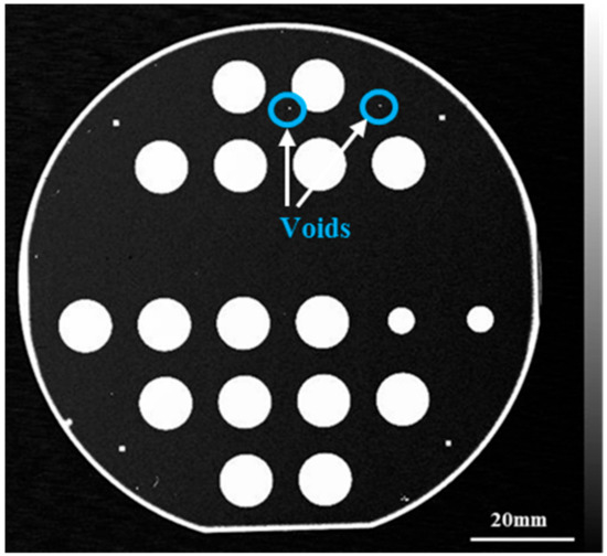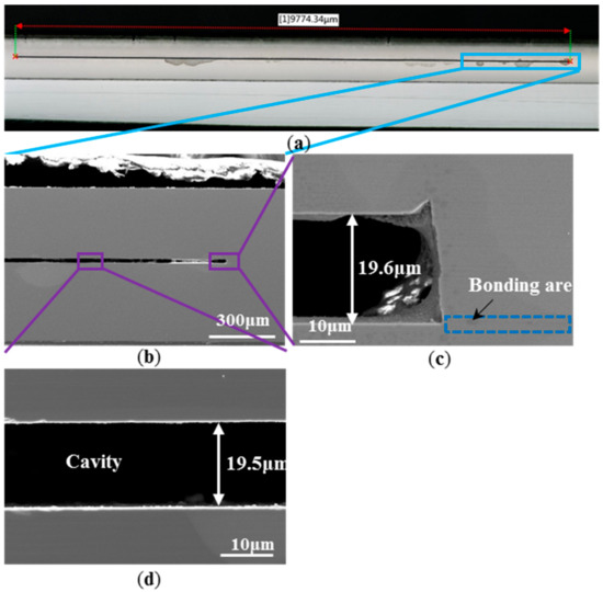 Figure 3 describes the SAM image of the SiC bonded wafer, which shows that the majority of the wafer area was bonded very well except for sporadic little voids and the edge area. By analyzing the experimental process, the voids may arise from particle contaminations. Figure 4a is the optical microscope image of the bonding interface cross section of the bonded sample with a cavity diameter of 1 cm, and the measured diameter was 9774.34 μm. It is difficult to ensure that the sample is ground to the standard diameter, so there was some error from the standard diameter value of 1 cm. Figure 4b is the SEM image of the bonding interface section of the sample, adjacent images Figure 4c,d are the local magnification images. In Figure 4c, the blue dotted line box is the bonding interface area, where we cannot see obvious traces of the bonding interface. The measured cavity height was about 19.5 μm, which is consistent with the 20 μm depth of cavity etching in the ICP process. From Figure 4b, it can be seen that there was some contamination in the gap of the cavity, which was produced during the grinding and polishing of the sample cross section.