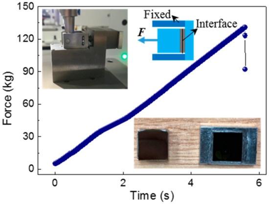 To characterize the bonding strength of the bonding interface, a tensile test was performed. As shown in the illustrations in the upper left corner of Figure 6, the two illustrations are the physical image and section diagram of the fixture for the tensile test, respectively. Before the test, two metal blocks were glued to the two sides of the bonded sample, as shown in the illustration in the upper right corner of Figure 6. The metal block on the right was fixed by fixture, at which time a horizontal tensile force to the left was applied to the other metal block. As shown in the test curve in Figure 6, tension force increased with the increase of time, and the bonded interface separated at the moment of maximum tension, and the value was 130.838 kg. The tested sample was a chip with cavity diameter of 1 cm and its bonding area was 1.465 cm2. Tensile strength can be calculated by: