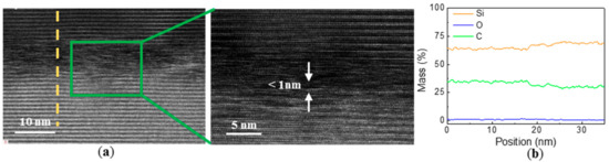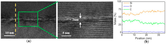 In order to further investigate the bonding properties of the bonding interfaces, a TEM cross-sectional image of the wafer bonding interface is illustrated in Figure 5a and its enlarged image, where no visible voids or cracks appear. At the interface, a bright seamless intermediate layer of about 8 nm should be amorphous because it has no lattice fringes and is distinct from adjacent crystalline phase. From data by previous studies, amorphous layer formation was caused by Ar-FAB bombardment [29,30]. Accordingly, EDX liner mapping of Si, C and O elements distribution of a small sample is shown in Figure 5b, the analysis location and range are roughly shown as the yellow dotted line in Figure 5a. It can be seen that there is a peak of O element at the bonding interface, because there was residual O element on the two wafer surfaces after the Ar plasma bombardment process. Additionally, Si and C spectra have remarkable troughs, the position of the troughs correspond to the position of the peak of element O, that is, the position of the intermediate layer of the bonding interface.