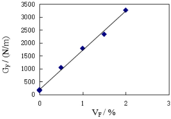 Figure 6 shows the effect of VF on the GF of SFRC. It can be seen, compared with the reference group concrete, that the addition of steel fiber greatly improves the fracture energy of concrete matrix, and with the increase of VF, GF keeps an obvious linear increasing trend. For every 0.5 percentage point increase in VF, GF increases between 30.53% and 71.14%, with an average increase of 47.22%. It can be seen from Table 2 that, compared with the control group concrete, the GF gain ratio of SFRC specimens is between 5.88 and 20.52, and that the average gain ratio is 12.88. It can thus be seen that the addition of steel fiber greatly improves the energy absorption capacity of the concrete matrix.