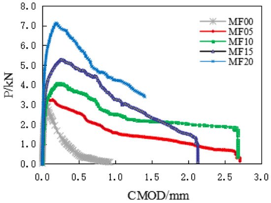From the test data analysis in Table 2, it can be seen that, compared with the reference group concrete specimens, the addition of steel fiber increases the CMODC and CTODC of matrix concrete, and that with the increase of VF, CMODC increases linearly, and the deflection corresponding to CMODC also increases obviously.