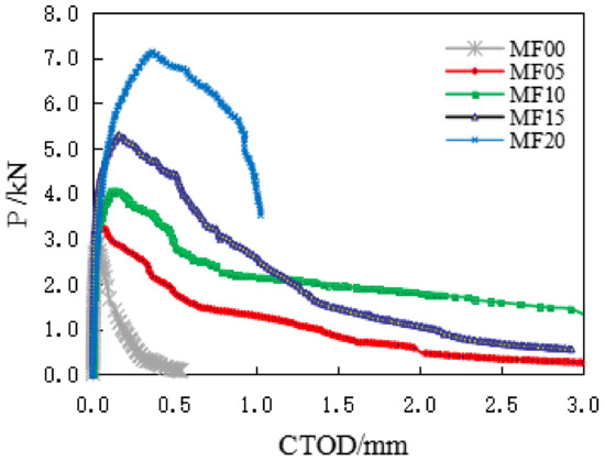 The typical load-CMOD diagram and load-CTOD diagram of a group of SFRC specimens recorded during the bending test is shown in Figure 8 and Figure 9. It can be seen from the figure that the crack opening displacement of the ordinary concrete specimen is almost linear elastic before reaching the peak load, and the crack opening displacement of the fiber-reinforced concrete specimen also shows linear elasticity at the initial stage of applying the load. It gradually enters the plastic stage with the continuous increase of the load, which is an extensive cracking process, obviously different from the ordinary concrete specimen.