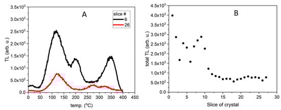 TL signal of LMP doped with 0.8-mol% Tb: (A)—TL glow curve for slice #6 is typical for the curves for slices 1–12, curve for slice #26 is typical for the curves for slices 13–27. (B)—Integrated TL signal in the temperature range between 20 °C and 400 °C calculated for all TL curves. The samples were irradiated with 0.2 Gy of beta rays in the Risø reader. Slice of crystal—numbers represent labelling of samples along the crystal length, as illustrated in Figure 1.