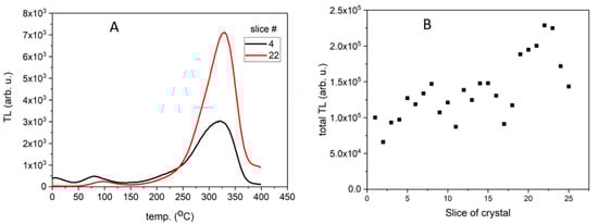 TL signal of LMP doped with 0.8-mol% Tm and 10-mol% B. (A)—TL glow curves for slices #4 and #22. (B)—Integrated TL signal in the temperature range between 20 °C and 400 °C calculated for all TL curves. The samples were irradiated with 0.2 Gy of beta rays in the Risø reader. Slice of crystal—numbers represent labelling of samples along the crystal length, as illustrated in Figure 1.
