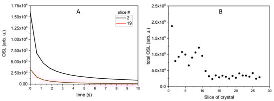 OSL signal of LMP doped with 0.8-mol% Tb. (A)—OSL decay curves for slices #2 and #19, typical for all slices, differing only in amplitude. (B)—total OSL signals integrated from 0 to 300 s for all OSL curves. The samples were irradiated with 0.2 Gy of beta rays in the Risø reader. Slice of crystal—the numbers represent labelling of samples along the crystal length, as illustrated in Figure 1.
