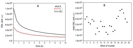 OSL signal of LMP doped with 0.8-mol% Tm and 10-mol% B. (A)—OSL decay curves for slices #7 and #22. (B)—total OSL signals integrated from 0 to 300 s for all OSL curves. The samples were irradiated with 0.2 Gy of beta rays in a Risø reader. Slice of crystal—the numbers represent labelling of samples along the crystal length, as illustrated in Figure 1.