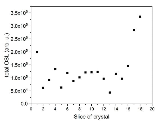 OSL signal of LMP doped with 1.2-mol% Tm and 10-mol% B integrated from 0 to 300 s for all OSL curves. The samples were irradiated with 0.2 Gy of beta rays in a Risø reader. Slice of crystal—the numbers represent labelling of samples along the crystal length, as illustrated in Figure 1.