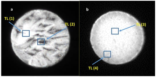In the case of conventional TL measurements, the signal is collected from the whole surface of the sample and is treated as a sum of the total TL signal emitted by the sample. By replacing the photomultiplier tube with a CCD camera, an image of the TL signal distribution on a given surface can be obtained. Two-dimensional TL readouts were performed in a special TL reader constructed specifically for the measurement of the dose distribution on homogeneous samples. However, after irradiation with an equal dose of the entire surface, it also allows an observation of the sites both more and less sensitive to radiation [29,30,31,32].