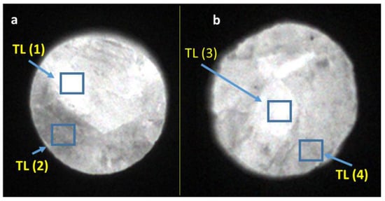 Two-dimensional TL readouts were performed with a reader with a CCD camera, which was constructed at the Institute of Nuclear Physics Polish Academy of Sciences [33,34,35,36]. The TL reader is equipped with a 60-mm diameter steel heater, the temperature of which can be raised linearly up to 400 °C, with heating rates ranging from 1 °C/s to 10 °C/s. The signal is recorded by a PCO SensiCam TM VGA CCD 12-bit camera, which registers the light signal with a dynamic range of up to 4500 counts per pixel. The samples were read out at a heating rate of 3 °C/s. The measurements consisted of recording the light emitted from the samples integrated over the entire temperature range up to 350 °C. After being heated up to 350 °C, the samples were slowly cooled down to room temperature. Each sample was irradiated with 1-kGy beta-particle dose to obtain TL glow curves (TL intensity vs. temperature) from selected areas of the sample by recording the sequential images every 2 s.