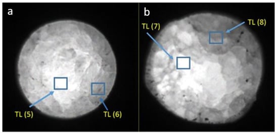 Images of the luminous surface of samples No. 7 (a) and No. 17 (b) cut out from the LMP crystal doped with 1.2-mol% Tm and 10-mol% B. The images were recorded in a reader with a CCD camera after irradiation with 20 Gy of beta rays. Marked boxes correspond to the sites of TL signal measurement.