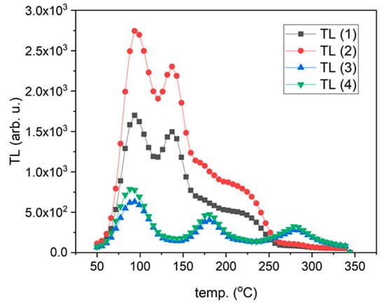 In contrast to the curves described above, all curves for the samples of Tm-doped LMP crystals had a similar shape regardless of the Tm concentration (0.8 mol% or 1.2 mol%) and the part of the crystal where the samples were obtained from. The only difference was observed for the main peak amplitude (Figure 3A). In this case, the most prominent peak was in the temperature range between 300 °C and 380 °C. The peaks of TL glow curves registered for higher Tm doping (1.2 mol%) had a significantly lower amplitude.