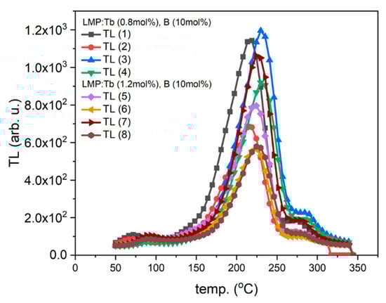TL glow curves of LMP doped with 0.8-mol% Tb recorded for areas selected from the surface of the samples (indicated in Figure 7).
