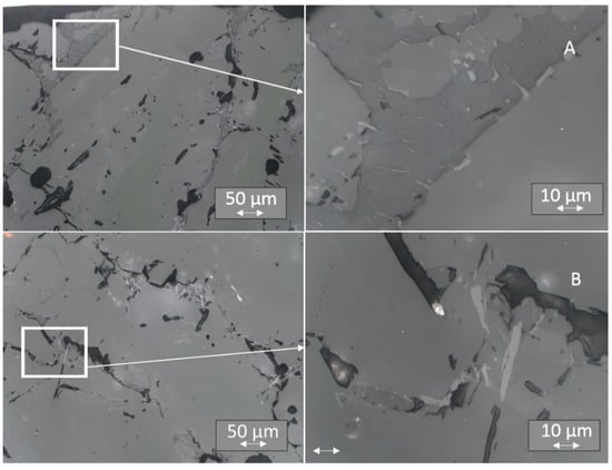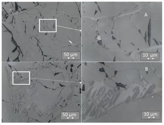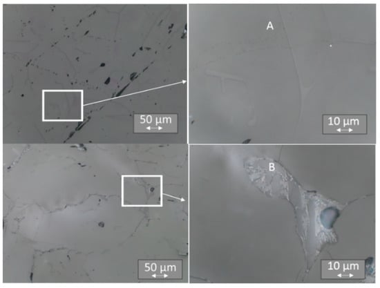 Microstructure of LMP doped with 0.8-mol% Tm and 10-mol% B. Top panels (A)—sample No. 7 at a magnification of 200× (on the left) and 1000× (on the right); bottom panels (B)—sample No. 22 at a magnification as above. The inset on the left has been further magnified on the right.