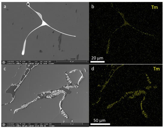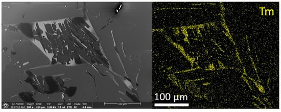 In contrast to LMPs doped with Tb, those doped with Tm (irrespective of the concentration) showed Tm presence in the whole investigated microregion, although there were visible areas with a larger amount of Tm (Figure 16 and Figure 17).
