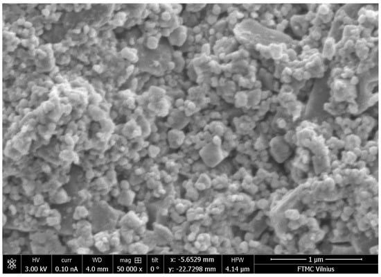 The weight concentrations of the components of the samples are presented in Table 1. The filler, the binder and functional fillers were mixed in an agate mortar for 30–40 min. After mixing, the obtained powders were uniaxially pressed under a pressure of 5 MPa, and the tablets were thermally treated up to 600 K for faster curing. The composites filled with BaTiO, FeO and hybrid were prepared. The samples are referred as BT, FO for barium titanate and magnetite filled samples respectively and BTFO for hybrid. The distribution of the nanoparticles was controlled by means of the scanning electron microscopy, Helios NanoLab 650 microscope (Thermofisher Scientific, Hillsboro, USA) (Figure 1).