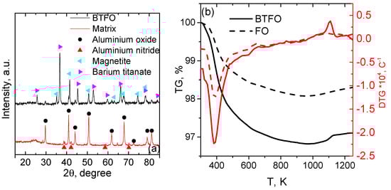The comparative X-ray diffraction analysis of the BTFO sample and the phosphate matrix is presented in Figure 2a. The spectrum of the matrix demonstrate only AlO and AlN peaks. The BTFO sample brings the peaks of BaTiO and FeO, some of peaks of AlO remains.
