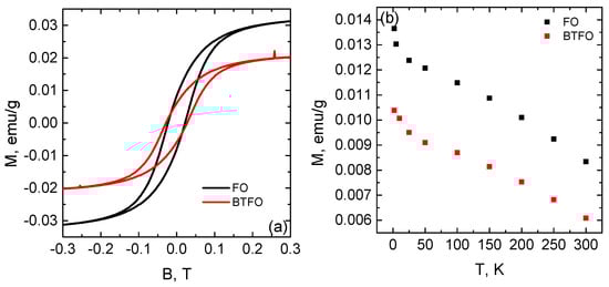 Magnetic hysteresis loops of the BTFO and FO samples (a). The temperature dependence of the remnant magnetization (b).