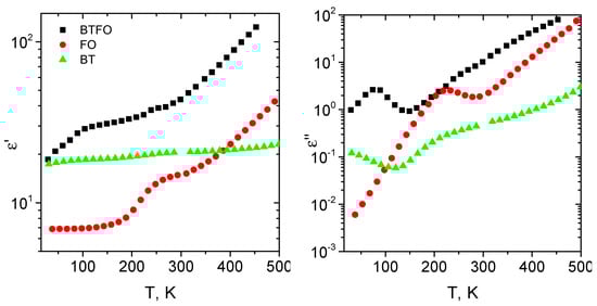 The temperature dependencies of the dielectric properties of the samples are presented in Figure 4. Since the mean particle size of the BaTiO particles is lower than the critical size of 110 nm [29], the anomalies related to the phase transitions were not expected in the temperature dependencies [30]. Both parts of the permittivity of the BTFO sample are higher than the of the BT or FO samples.