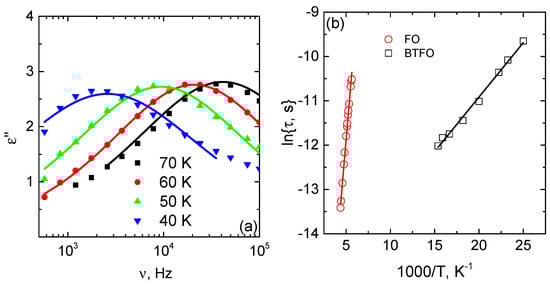 Frequency dependence of the dielectric losses of the BTFO sample: symbols—measured results, curves—Cole–Cole fit (2) (a). The temperature dependence of the relaxation time. Symbols—measured results; curves—Arrhenius fit (b).