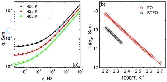 Frequency dependence of the conductivity of the BTFO sample. Symbols are the measured data, curves—fit with Equation (3) (a). The temperature dependence of the DC conductivity. Symbols—measured results; curves—Arrhenius fit (b).