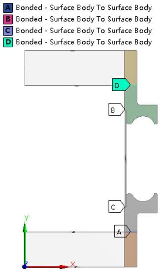 Hydroforming process of bellows includes three stages, namely bulge stage, fold stage and springback stage. For the toroidal bellows studied here, the pressure increases linearly from 0 to 3 MPa at the bulge stage, then increases linearly to 13 MPa at the fold stage and decreases to 0 at the springback stage. The pressure is loaded inside the tube blank, as indicated by B in Figure 6. At the bulge stage, the stiffening rings are supported by blocks, and the displacement is 0. Specified displacement is loaded on the top mold, as indicated by A in Figure 6. At all stages, the bottom mold has no displacement in any direction, so the displacement is set to be 0 as indicated by C in Figure 6.