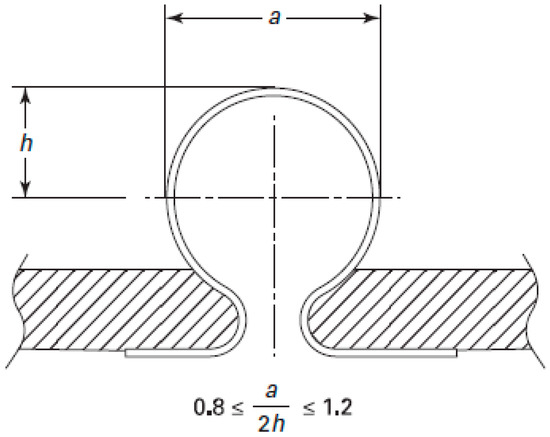 The relative wall thickness reduction (δ) and the ratio of structural parameters (a/2 h) are usually used to reflect the bellows hydroforming quality. Clearly, a better hydroforming quality requires that a/2 h should be close to 1 and δ should be small. According to ASME VIII-1 [17], the structural parameters of bellows should meet the requirements as shown in Figure 15.