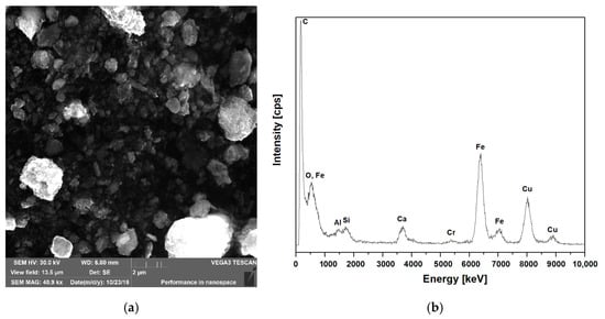 SEM of iron oxides concentrate and EDS analysis. (a) SEM image of IOC; (b) EDS analysis.