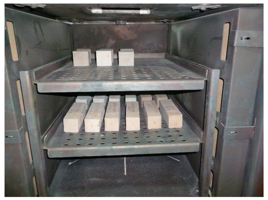 The flexural and compressive strength of the mortars was determined according to the Standard BS-EN 196-1 [50]. The mortars specimens were prepared in the form of the beams of the sizes 40 mm × 40 mm × 160 mm. The specimens after demoulding were stored in the climatic chamber at the relative humidity RH ≥ 95% and the temperature 20 ± 2 °C for 28 days until the testing. The specimens intended for the heating (at 300 °C, 450 °C, 600 °C and 800 °C), after curing for 28 days, were weighed and dried to the constant mass in the laboratory dryer at the temperature 105 °C. After drying the specimens were weighed again to determine the density in the dried state and then heated at the given temperatures. The heating was carried out in the chamber furnace PP 140/85 provided with temperature controlling device Ht Industry. The specimens were placed on the shelves in the furnace without contacting each other and without touching the heating elements (Figure 2). The heating procedure followed the RILEM TC 200-HTC recommendation [51]. In the first stage the temperature increases at the rate 1 °C/min. The maximum temperature was maintained for 1 h. The cooling runs at the rate 1 °C/min. The temperature in the furnace was controlled using the temperature control device and the thermal probe placed inside the furnace. The specimens were removed from the furnace when the temperature in the furnace was 50 °C; the previous studies done by the Authors have demonstrated that this ensures the repeatability of the conditions of heating and cooling the specimens.