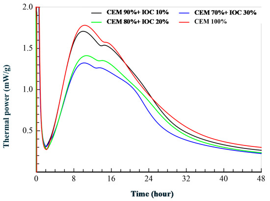 Heat flow calorimetry of the cement with different dosages of IOC.