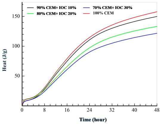 In the case of the mortars containing 10% and 20% of IOC (the mortars M10 and M20) a slight increase of the flexural strength in relation to the reference mortar was observed—by 2.2% and 5%, respectively. The compressive strength of the mortars M10 and M20 has increased in relation to the reference mortar by 8.9% and 10%. For the mortar M30 an increase of the flexural and compressive strength was also observed (by 2.7% and 8.8%, respectively), but the downfall tendency is visible as compared to the results obtained for the mortar M20. A decrease of the strength of the mortar M30 as compared to the mortar M20 is a result of an increase of the share of the fine fraction 0.25 to 0.125 in the entire aggregate, which will worsen the compressive strength with the further growth of the IOC content. Nevertheless, the substitution of 30% of the sand with the IOC allows to improve slightly the strength parameters of the mortars and keep the good workability (the superplasticizer was used in the amount of 2.5% of the cement mass). The similar results were reported in [38]. Worsening of the mechanical performance of the mortars was observed at 18% share of IOC in the aggregate, however no superplasticizer was used. An increase of the strength of the tested mortars is a result of the fact that the IOC acts as a filler, sealing the structure of the mortars. The dusty fractions of the IOC could act as crystallization nuclei for C–S–H phase, causing compaction of the composite structure and increase of the strength [13,49]. The SEM analysis in this range is necessary in the future. Investigation of the pastes hydration heat has confirmed that the addition of IOC can be used as a filling aggregate (addition of type I according to the European Standard EN 206 [15]) in the cement composites.