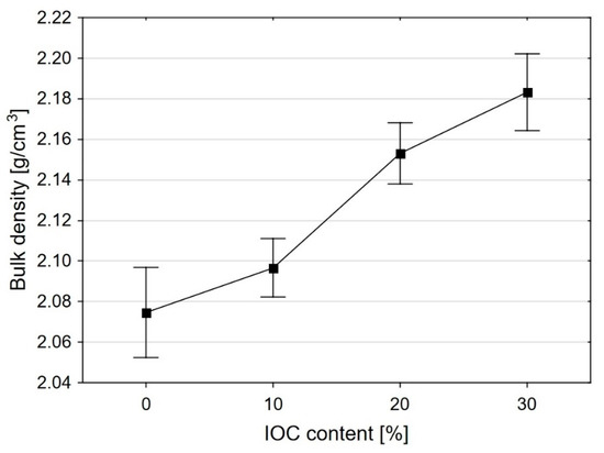 Change of the bulk density of mortars as a function of IOC share in the aggregate.