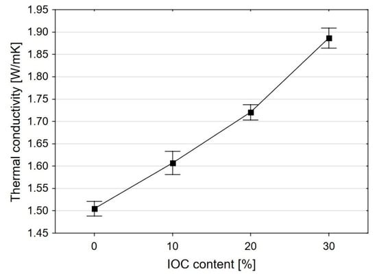 The thermal conductivity coefficient of the mortars, l, strongly depends on the share of IOC in the fine aggregate (Figure 6). Replacement of 10% of the sand volume by the IOC has caused an increase of the thermal conductivity on average by 28%. The thermal conductivity of the mortar M0 was on average 0.92 W/mK, while for the mortar M10 this value was 1.18 W/mK. In the case of the mortars M20 and M30 increase of the thermal conductivity in relation to the reference mortar M0 is not so big. This results from increasing content of the superplasticizer in the mortar. The research [55] has confirmed that addition of the IOC as the substitute for the aggregate leads to the significant increase of the thermal conductivity of the mortars. The coefficient l within the range from 1.5 to 1.95 W/mK (at the temperature of 25 °C) has been obtained for the mortars containing the IOC as the aggregate at the w/c = 0.5 [55].