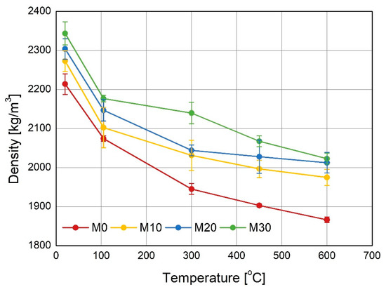 The changes in the density of the mortars specimens during heating at the high temperature are presented in the Figure 7. The clear impact of the IOC content in the aggregate on the density of the tested mortars is visible. The aggregate containing the IOC had finer grains distribution (see Table 2) and thus increased water demand. However, due to the higher density of the IOC and the use of superplasticizer, the initial densities of the mortars M10, M20 and M30 were higher. During the first stage of drying (at 105 °C) the free water, absorbed by the specimens when cured, has evaporated. In the consecutive stages of heating the fall of the density of the specimens containing the IOC is less rapid than that of the reference mortar M0. The decisive effect on the less falls of the densities of the mortars with IOC has the increased thermal conductivity of the concentrate, leading to the less cracking of the specimens during heating. This, in turn, causes the increase of the flexural and compressive residual strength, shown in the following figures.