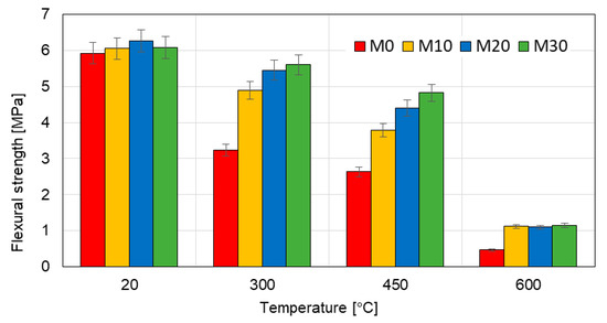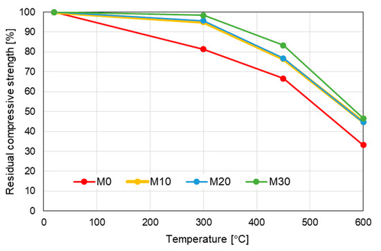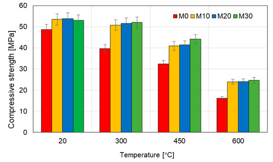 Similarly as in the case of the flexural strength, it is visible that the addition of IOC improves the mechanical performance at the high temperature. At 300 °C the mortars modified with the IOC maintain from 95% (the mortars M10 and M20) to 98% (the mortar M30) of their initial strength, while the reference mortar M0 reaches only 80% of its initial compressive strength. By analogy, in the case of heating up at the temperature of 450 °C the mortars with the IOC keep from 76% to 83% of their initial strength, while the mortars M0 only 66%. At the temperature of 600 °C all mortars with the IOC have similar residual strength about 45%, while the mortar M0 only 33%.