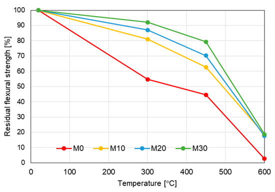 Evolution of residual flexural strength with temperature.
