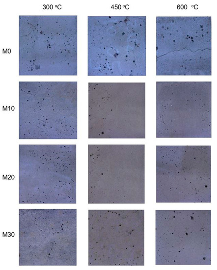 Pictures of four cement mortars heated at 300, 450 and 600 °C.