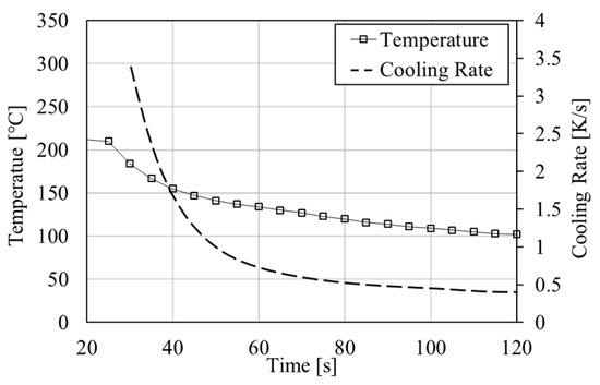 Temperature (solid squares) and cooling rate (dashed) during sample casting Sn-20 wt.% Bi sample.