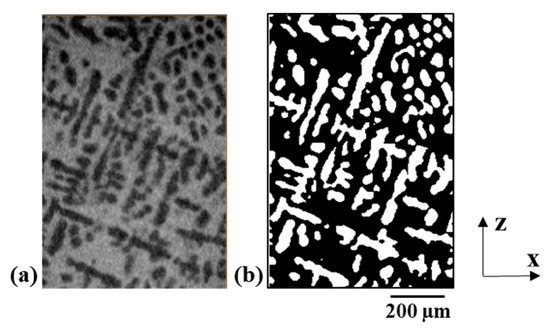Representative image obtained in the x-z plane from the 3D data for the Sn 58 wt.% Bi alloy. (a) Grey value image displays the primary phase (dark grey) and eutectic phase (light grey). (b) Corresponding segmented primary phase (white).
