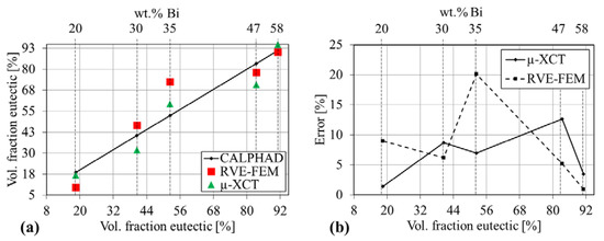 Eutectic volume fraction obtained from CALPHAD calculations, image analysis of µ-XCT data and the RVE-FE model. (a) eutectic volume fraction over composition (b) relative error of µ-XCT data and RVE-FE model based on equilibrium CALPHAD calculations over composition.