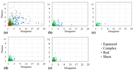 Flatness over elongation for Sn-Bi alloys based on the segmented µ-XCT data. Morphology classes are equiaxed (green), complex (red), rod (blue), sheet (grey). (a) Sn-20 wt.% Bi (b) Sn-30 wt.% Bi (c) Sn-35 wt.% Bi (d) Sn-47 wt.% Bi (e) Sn-58 wt.% Bi.
